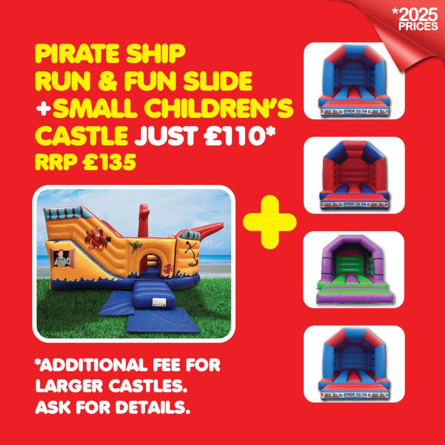 The Pirate Ship Fun Run and a thematic bouncy castle make for an immersive experience, especially suitable for pirate-themed parties or adventurous celebrations. This deal turns your event venue into a bustling pirate cove! The combination of a small bouncy castle with the compact but exciting Pirate Ship Fun Run makes this deal adaptable to both large and smaller venues.