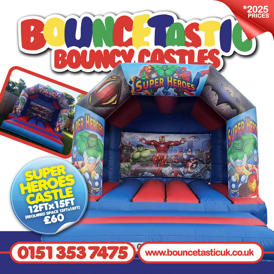 If you are unsure whether we deliver to you, or if you have any questions about this superheroes bouncy castle or any of our other inflatables for hire in Liverpool, contact us and we'll be happy to help you out.