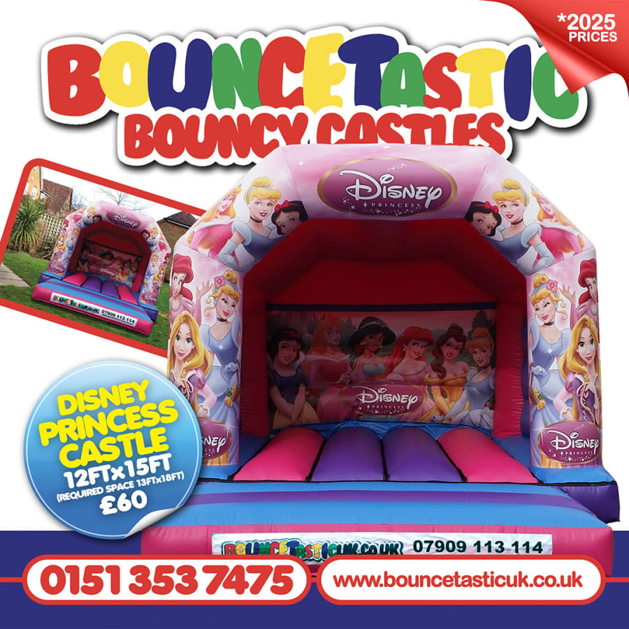 Bouncetastic Liverpool offer the perfect Disney Princess bouncy castle which is the ultimate party piece for a girl up to the age of 13. The characters displayed on the pink and blue bouncy castle include all of your favourite Disney favourites such as: Jasmine (Aladdin), Belle (Beauty and the Beast), Cinderella, Rapunzel, Snow White and Ariel (The Little Mermaid).
