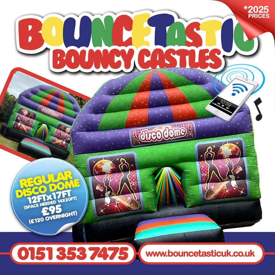 Transform your garden or event space into the hottest nightspot in Liverpool by hiring the fantastic inflatable and bouncy green Disco Dome we have on offer at Bouncetastic! Your guests won't be able to believe their eyes once they see this Disco Dome set-up and ready to go, and once they step inside, they've got an unforgettable thrill in store. Not only is there a soft dance floor which makes throwing shapes and grooving so much fun, there's also dazzling LED flashing party lights and even a booming speaker that you can control yourself. That's right, simply connect via the Bluetooth on your phone and get picking your favourite smash hits. There's no chance of a song you don't love being played, because you are the DJ all night long. Our Disco Dome is suitable for all ages, and the 12ft x 17ft space is ample room for plenty of guests at once. We always thoroughly check the dome, lights and speakers prior to delivery, so as soon as it arrives to your address it will be set up and ready to go in no time at all. Whether you're planning a birthday party, wedding, anniversary, stag or hen do, family get-together, graduation or anything else, this Disco Dome will be perfect and create a party atmosphere unlike anything you've seen before. What's best of all is that we offer overnight hire for a small extra fee, meaning the disco fun can really go on all night long. If you're in the Liverpool area, we are ready to bring the unique fun of the Disco Dome to you right now. This is always a popular product, so to avoid disappointment why not reserve it for your chosen date today? You can check availability and book within minutes through our website, so don't delay.