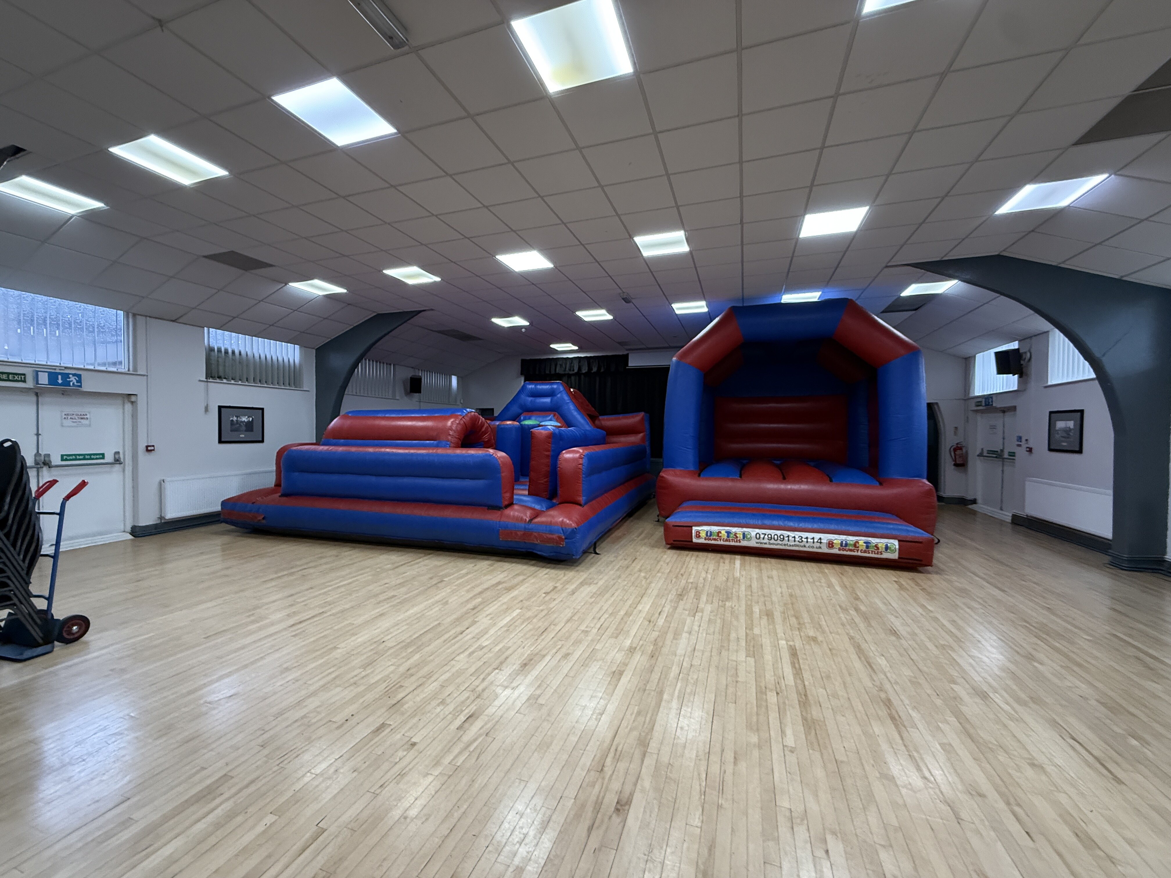 With its large wooden floor, high ceilings, and open layout, Whiston Town Hall is perfect for customers searching for bouncy castles Liverpool who need a reliable indoor venue. This setup included multiple inflatables while still allowing plenty of space for guests.