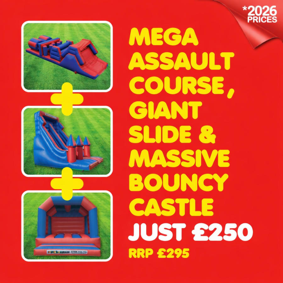 This party package is ideal for all occasions that call for an extra dose of excitement. From birthday parties and family fun days to school events, charity fundraisers and community festivals, the Assault Course, Giant Slide and Large Bouncy Castle package will be the highlight of the day.